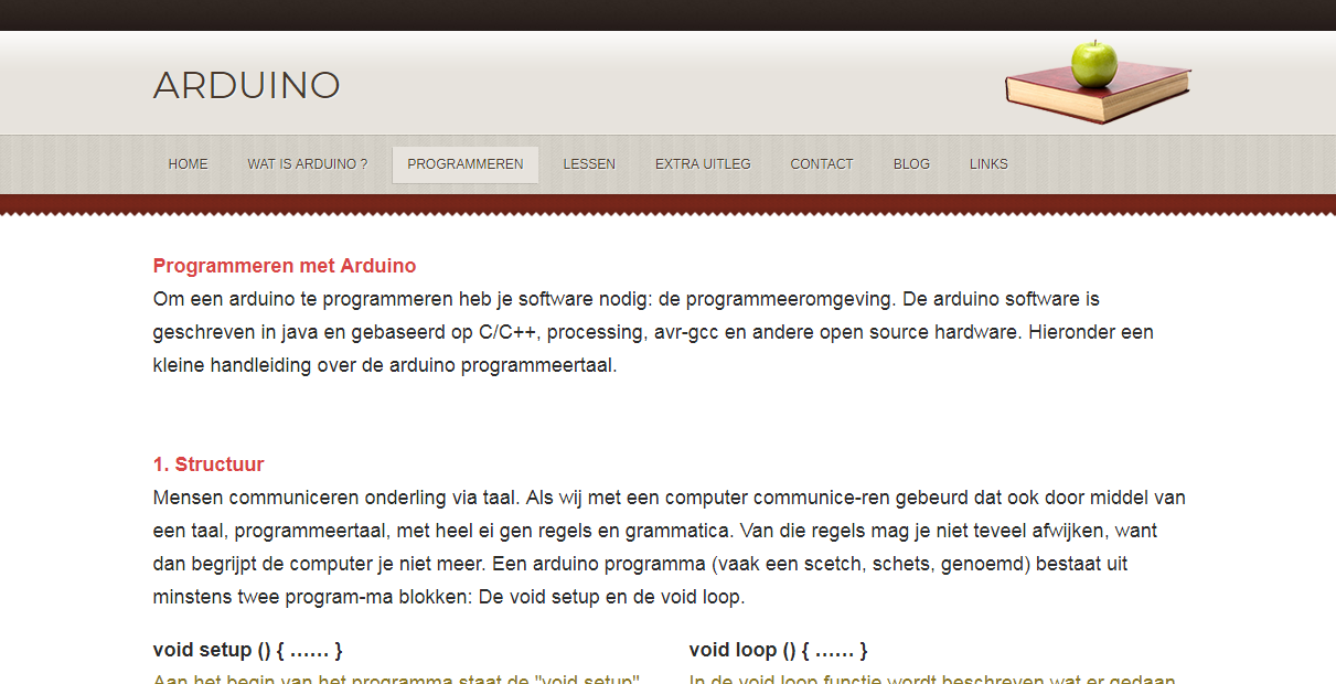 Deze website legt uit hoe je Arduino moet programmeren (dus eigenlijk hoe je zelf een Sketch kunt schrijven). Soms kan je niet de Sketch vinden die jij graag wilt, deze website helpt je bij het schrijven van je eigen Sketch. Ook staat er op deze website nog uitgelegd wat Arduino inhoud.